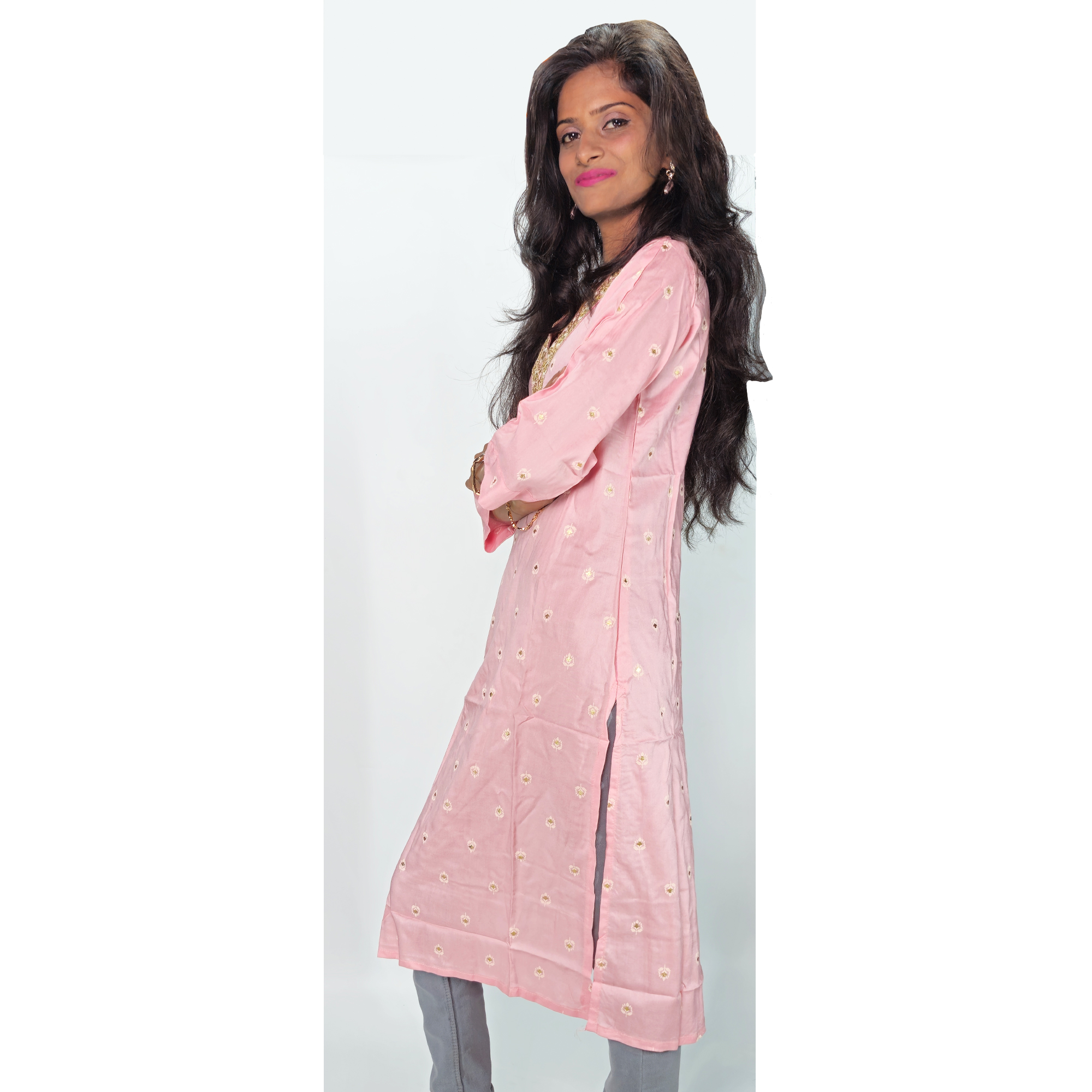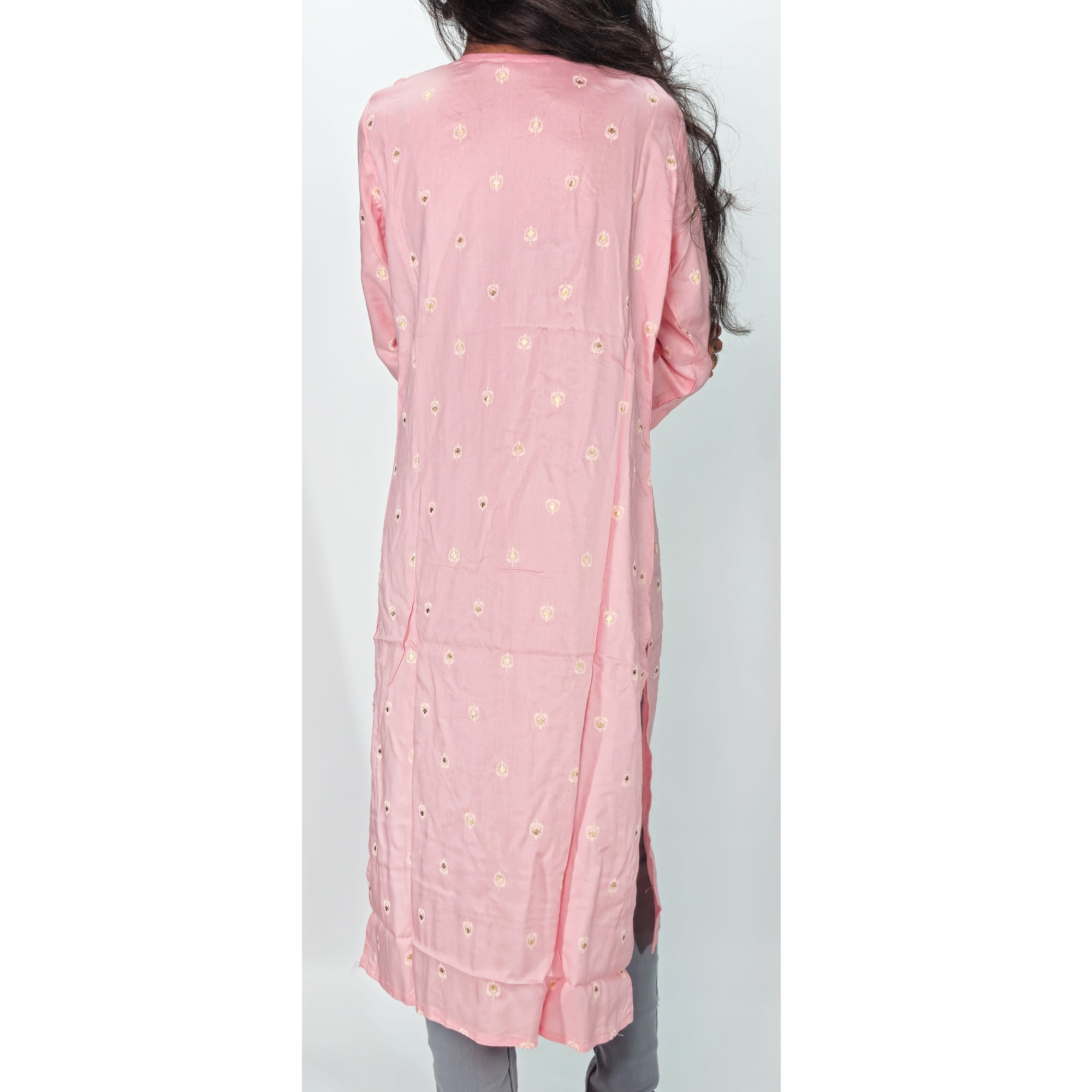 Style: It has an ethnic fusion style, often referred to in India as a maxi dress or a long Kurta/dress.
