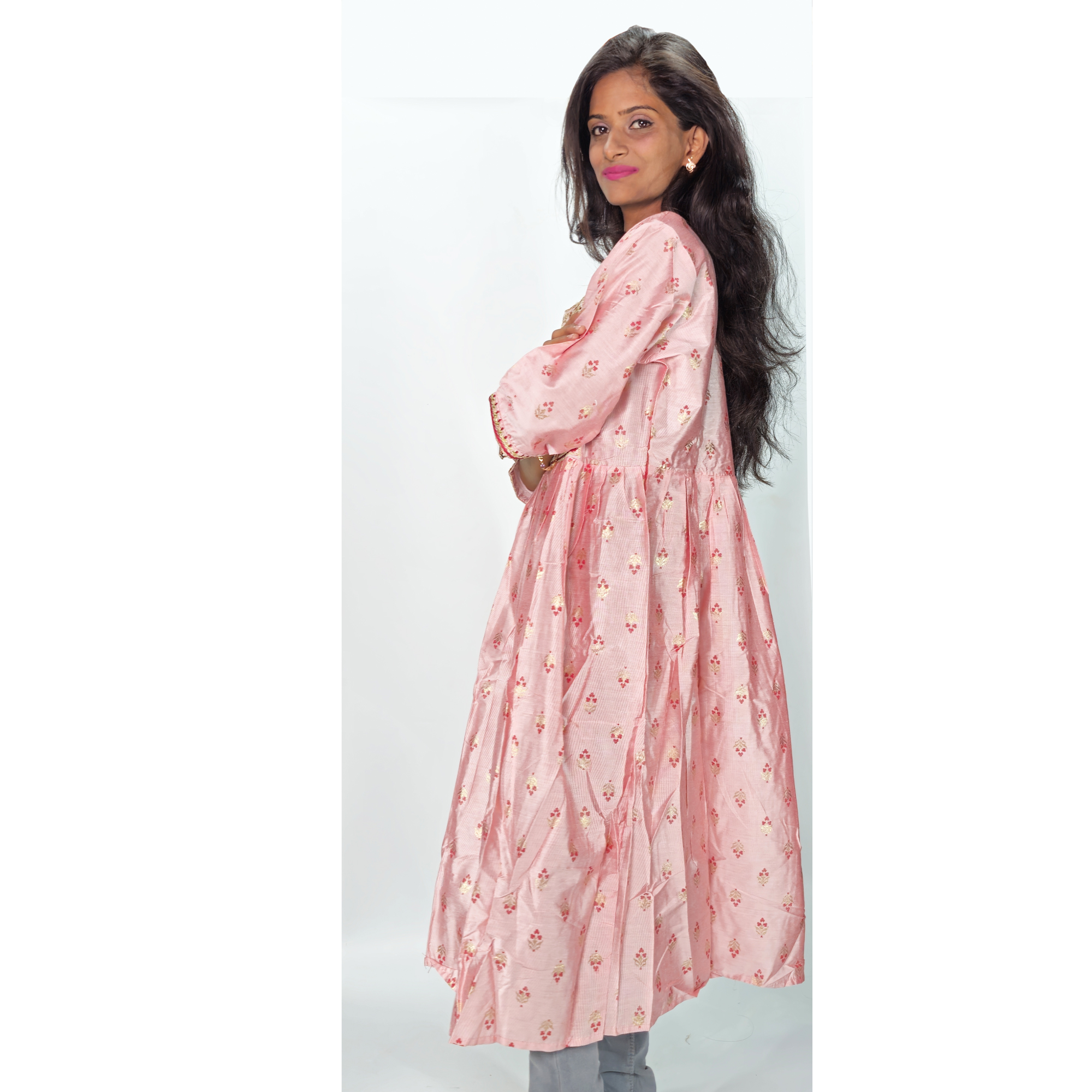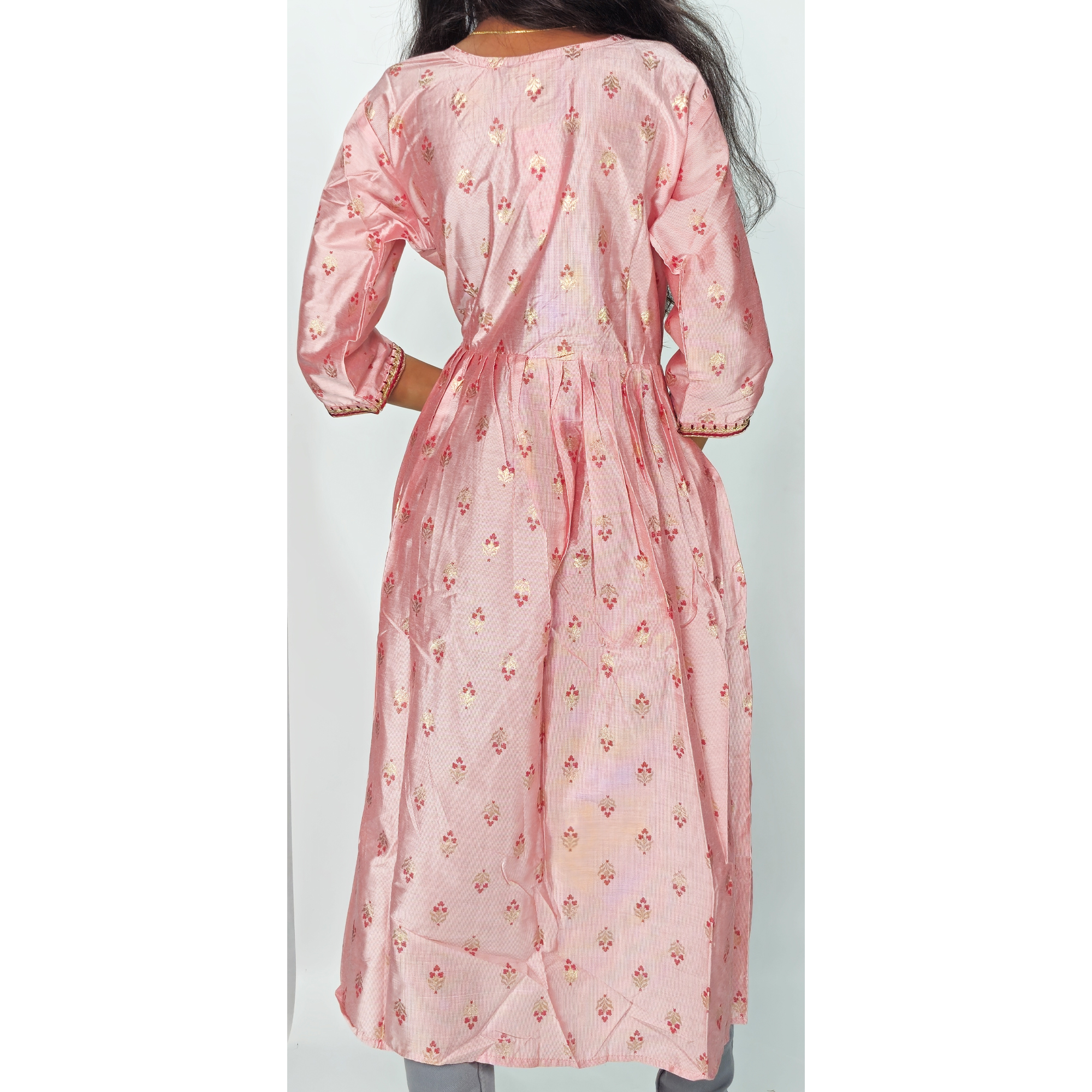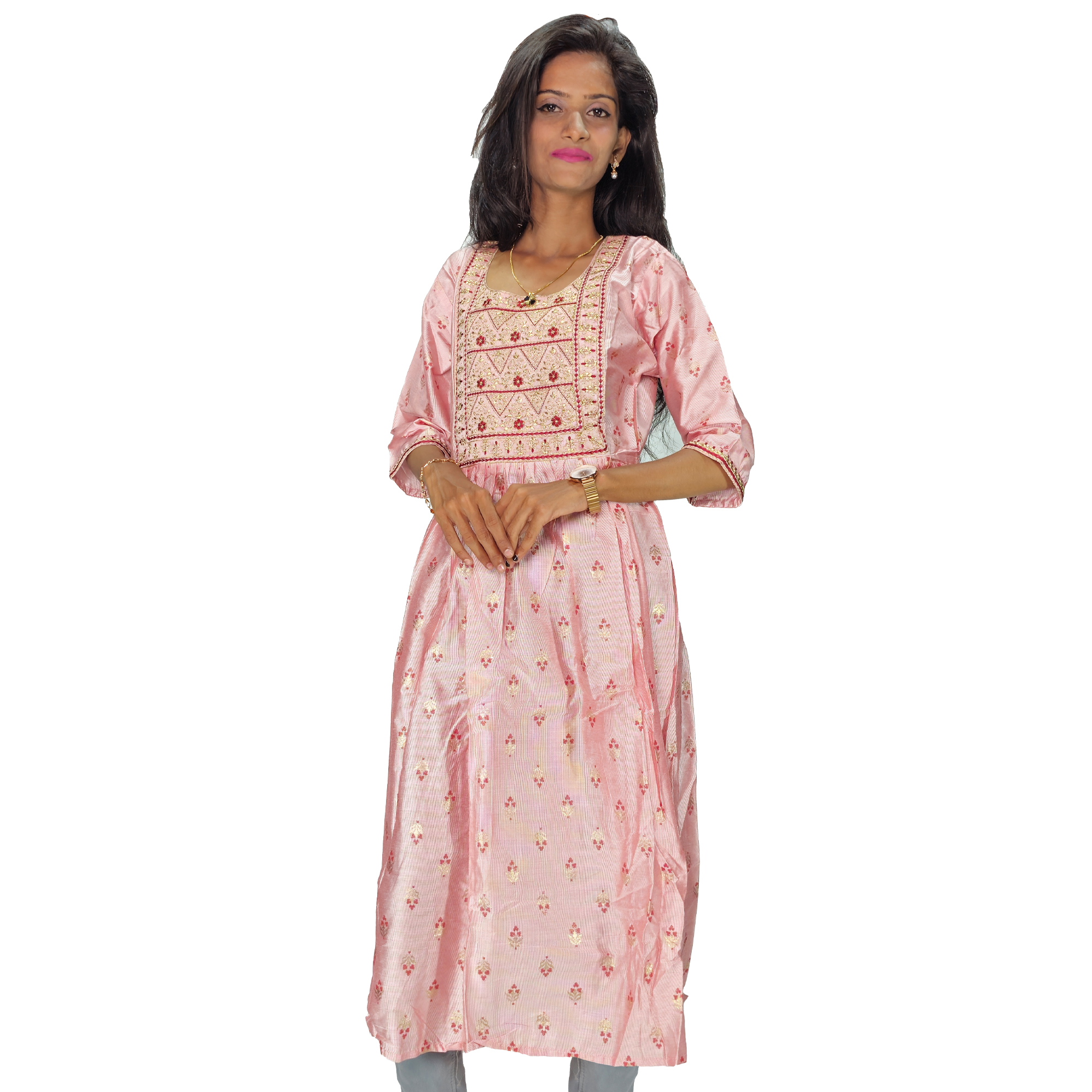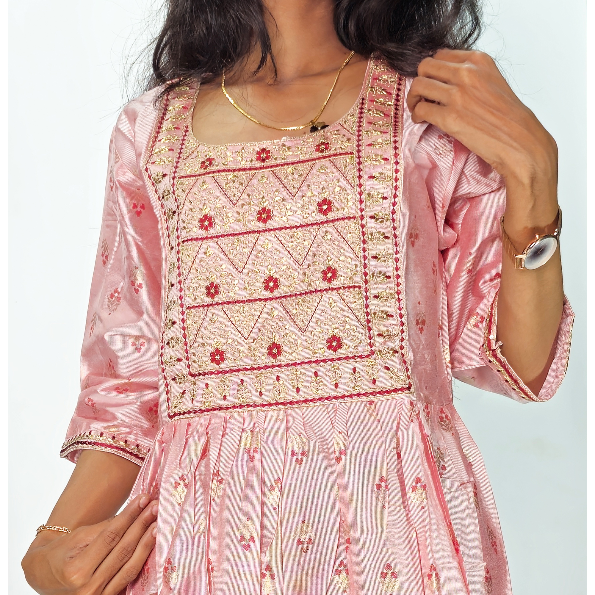 Color: Pink with soft golden and pink embroidery motifs