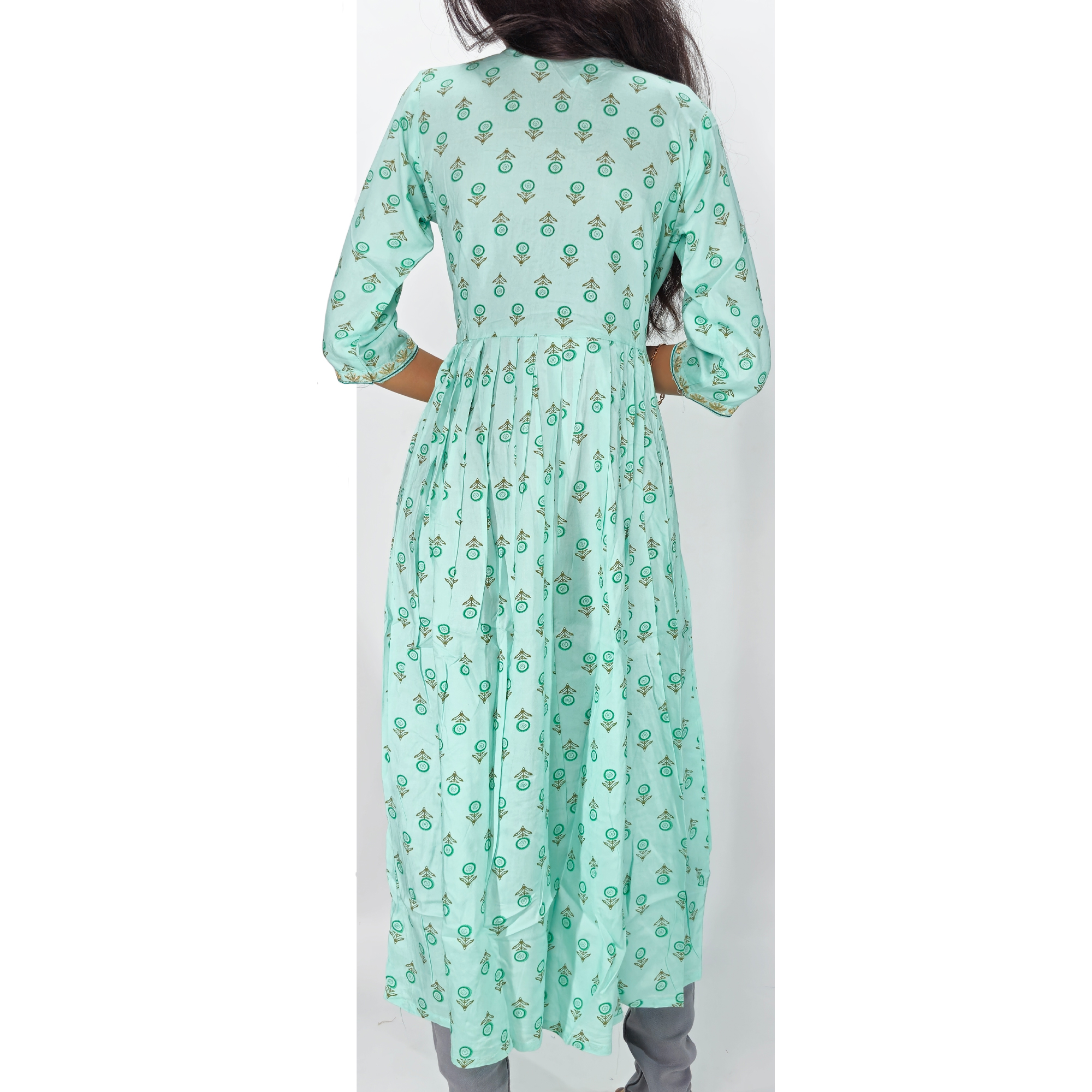 Color: Mint green with matching thread-work embroidery , and printed ethnic patterns across the fabric.​