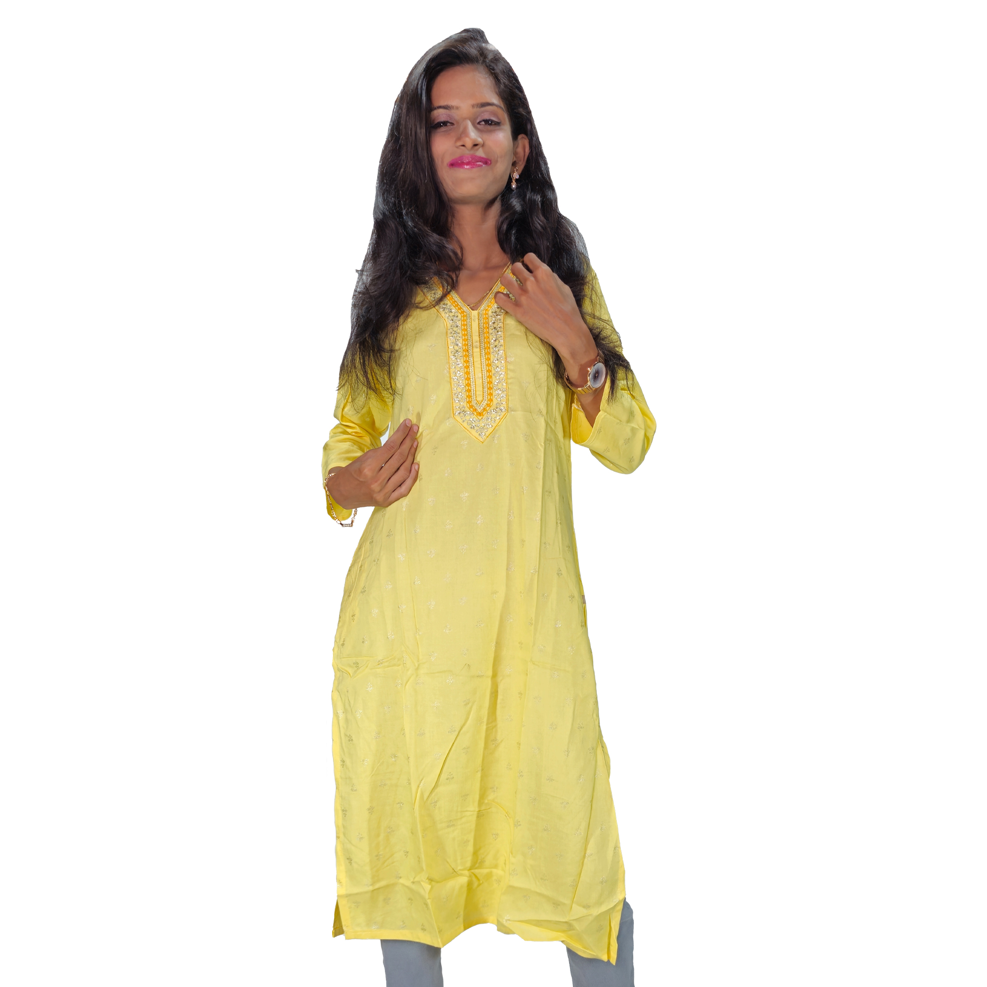 Design: Straight fit with three-quarter sleeves, round neckline with a V-shaped embroidered yoke, and mid-calf length.