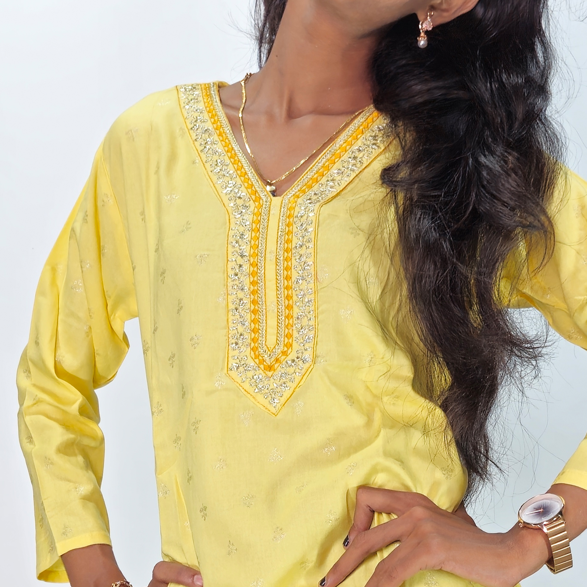 Color: Sunny yellow with embroidery detailing